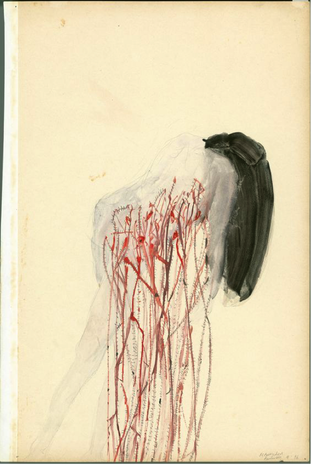 In 1997 Berlinde De Bruyckere made a series of drawings entitled “parasite”. They show us a bent over woman who is probably pregnant. Long hair veils her face. All kinds of black, skin-colored and blood-red tentacles rise ostentatiously from the bottom. These hook onto scars and appear to be entwined with her organism. Some tentacles resemble a spider's hairy legs. Others are like blood vessels perforating the boundary of the skin and merging with the substance of her body.